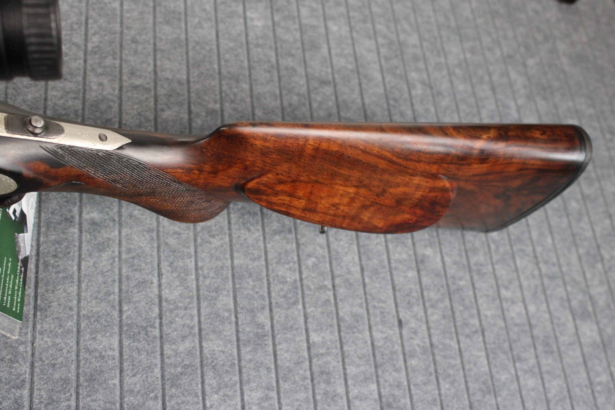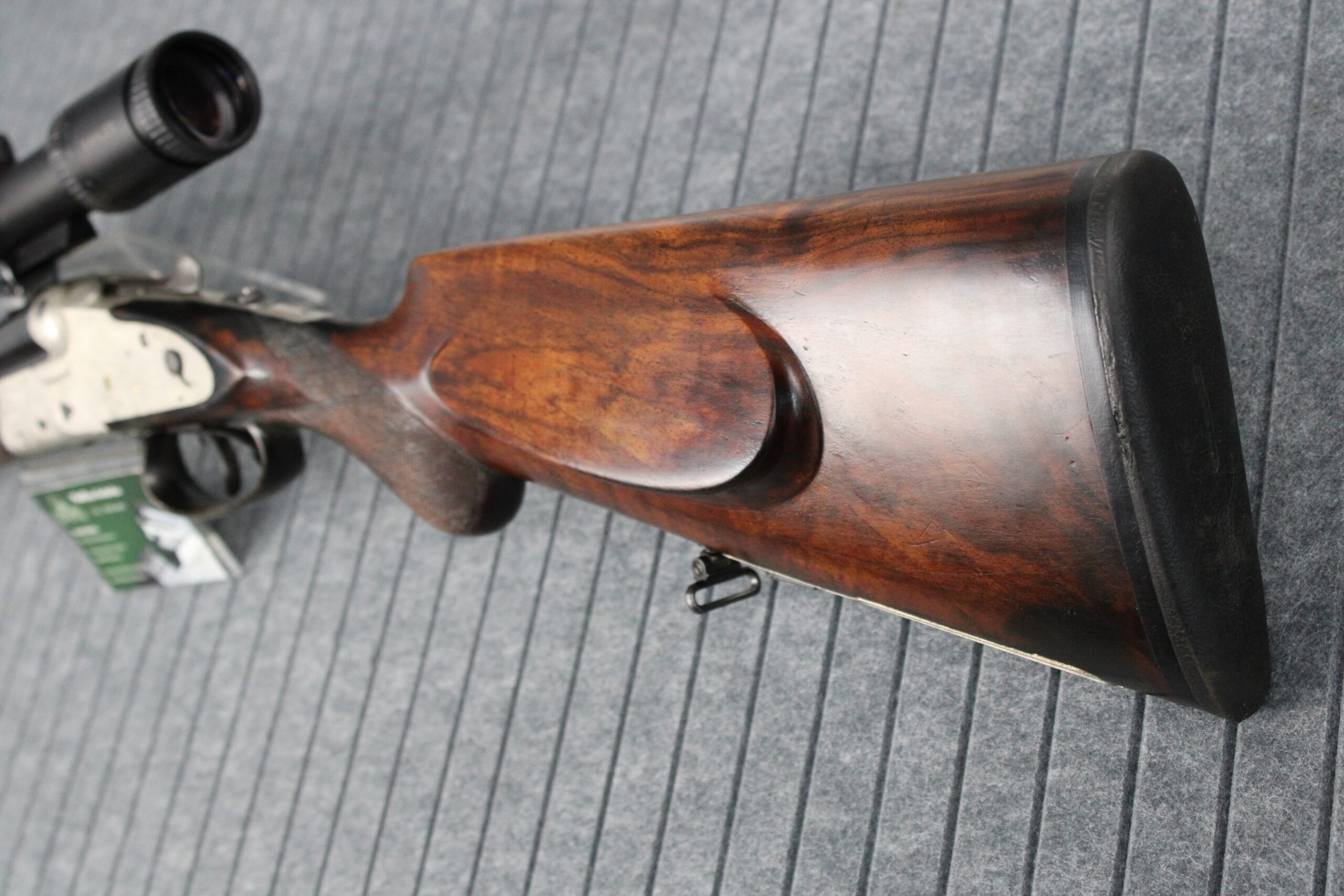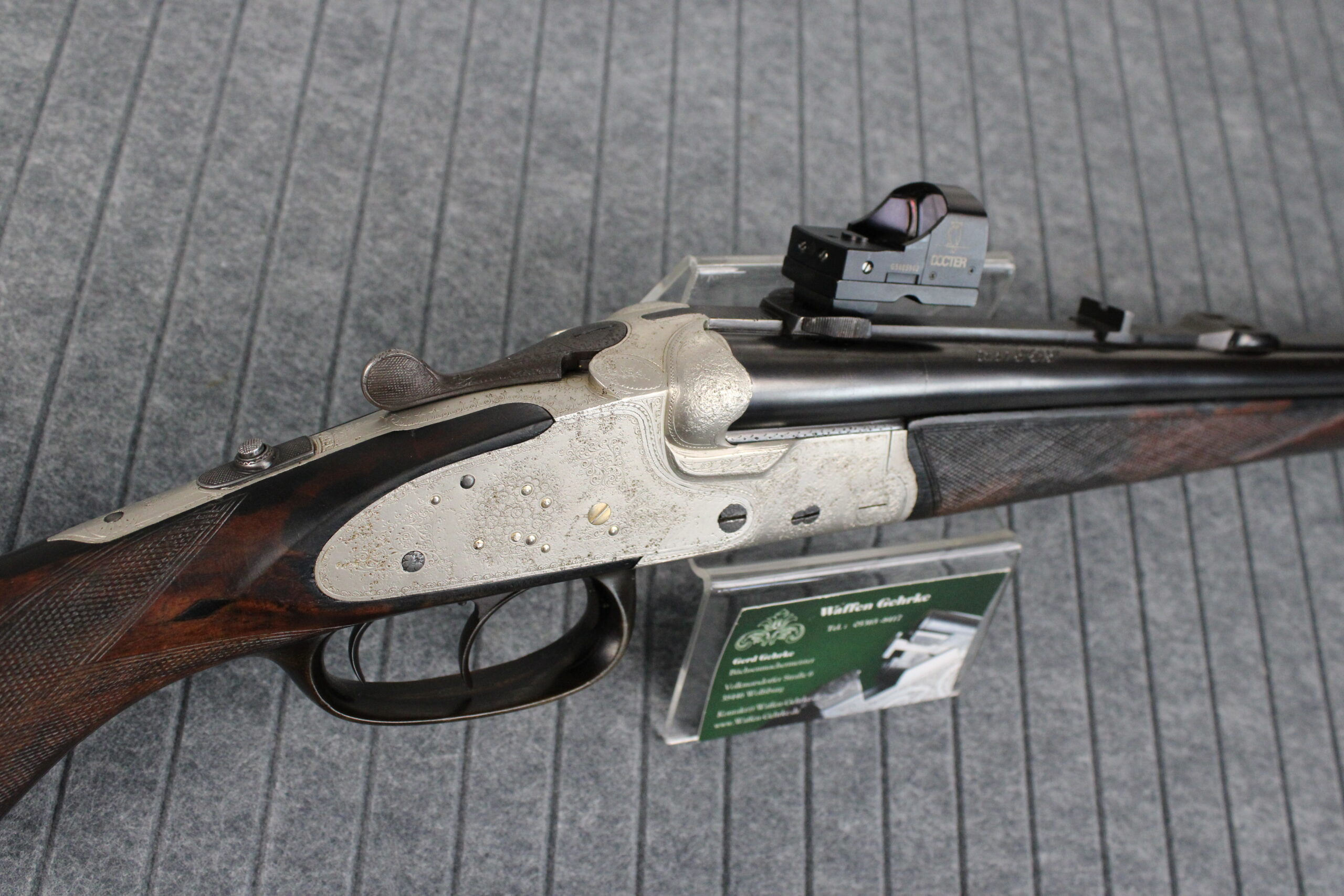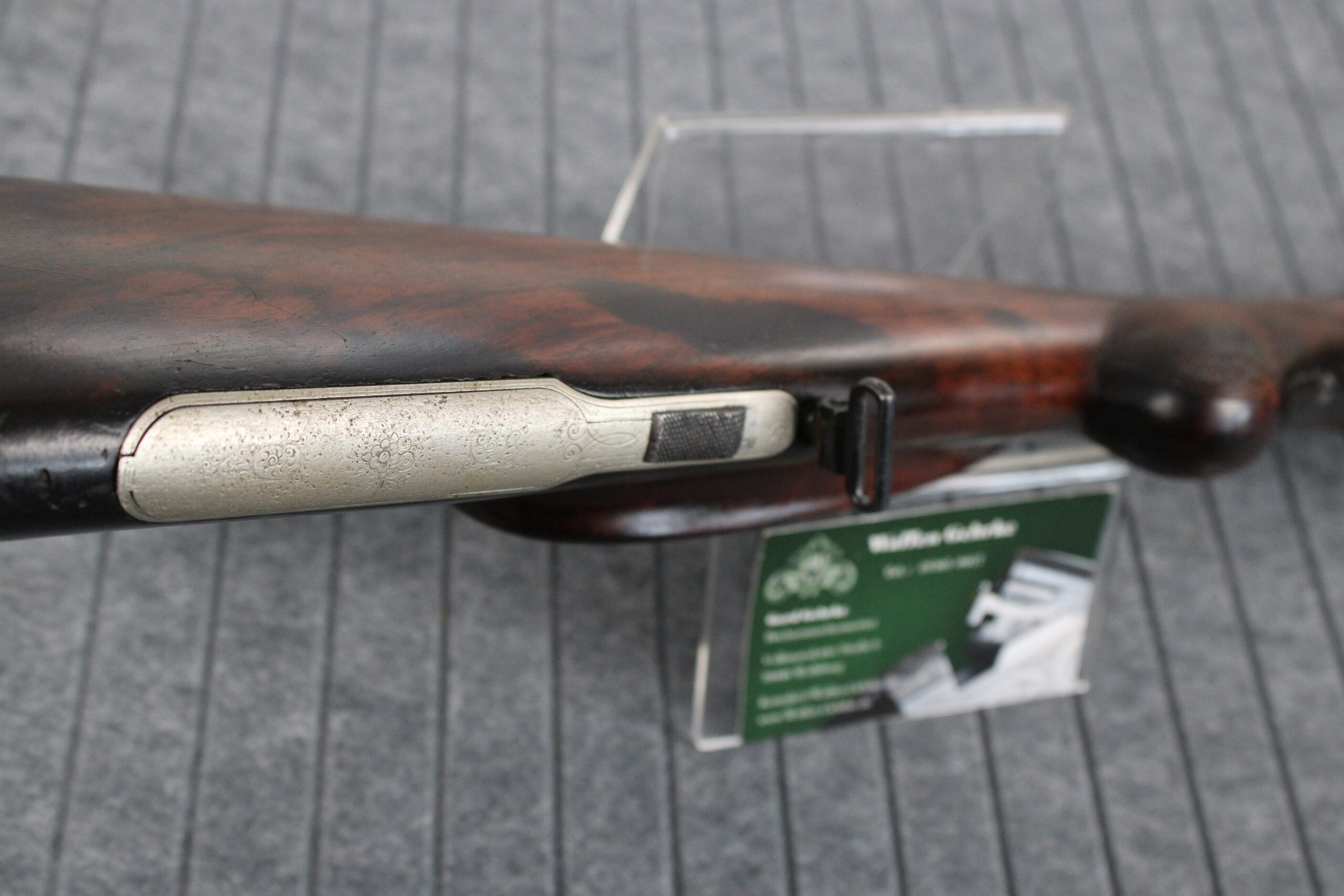 1982 Wurde der Drilling aufwendig zum Doppelbüchsdrilling umgearbeitet. Alle Läufe erneuert!Er hat einen Rückstecher in beiden Abzügen. Der Verschluss ist dicht.