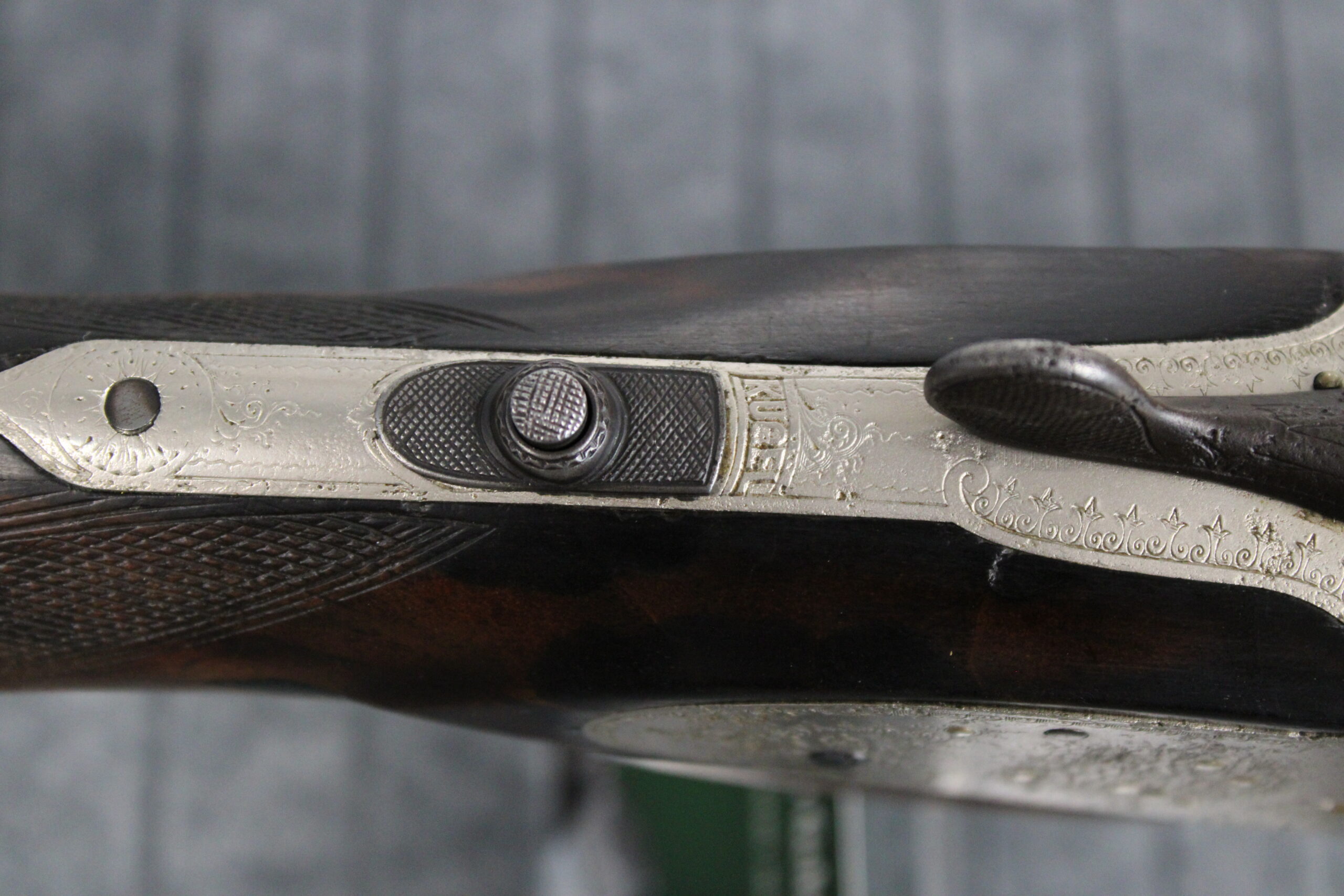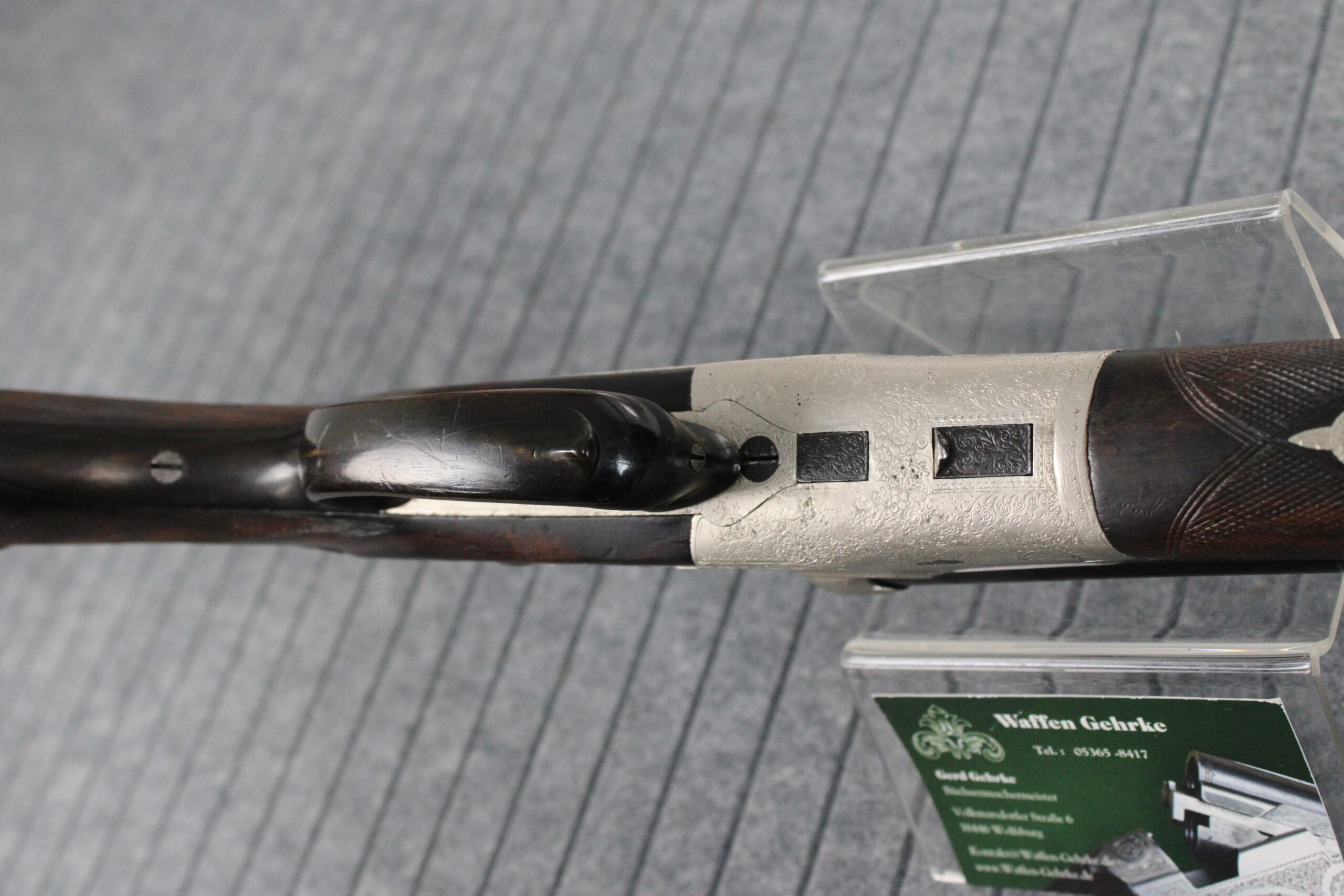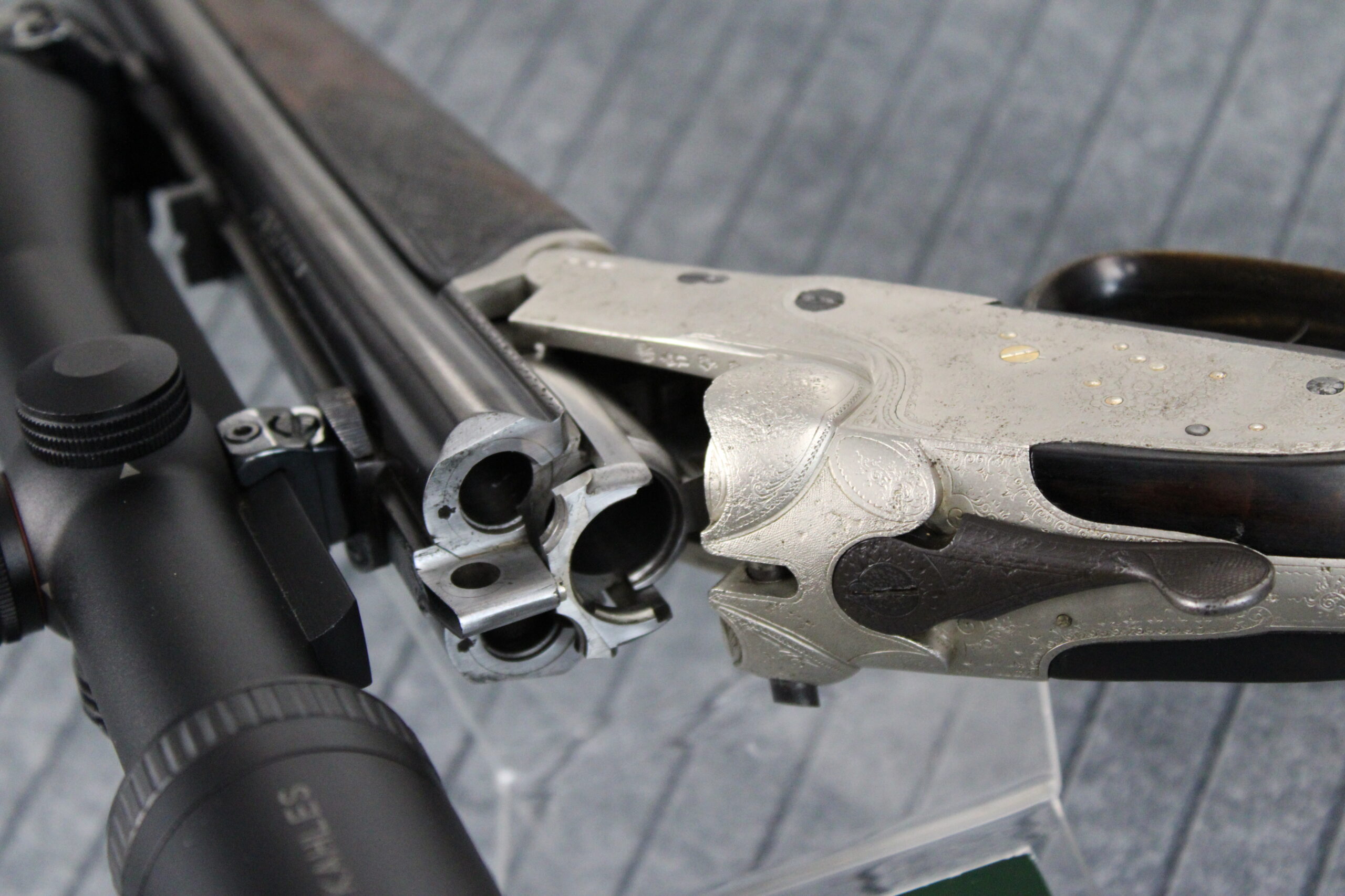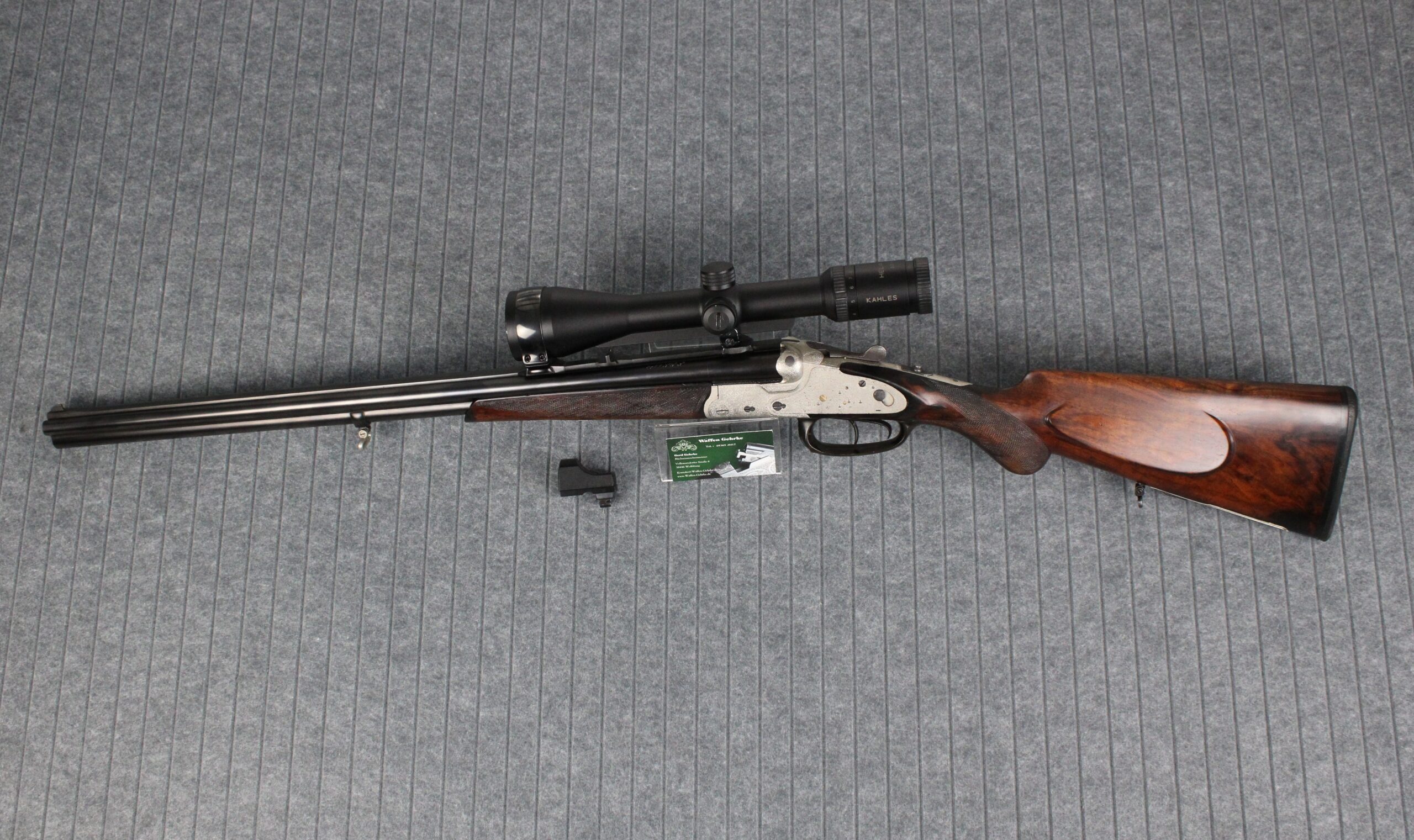 1982 Wurde der Drilling aufwendig zum Doppelbüchsdrilling umgearbeitet. Alle Läufe erneuert!Er hat einen Rückstecher in beiden Abzügen. Der Verschluss ist dicht.