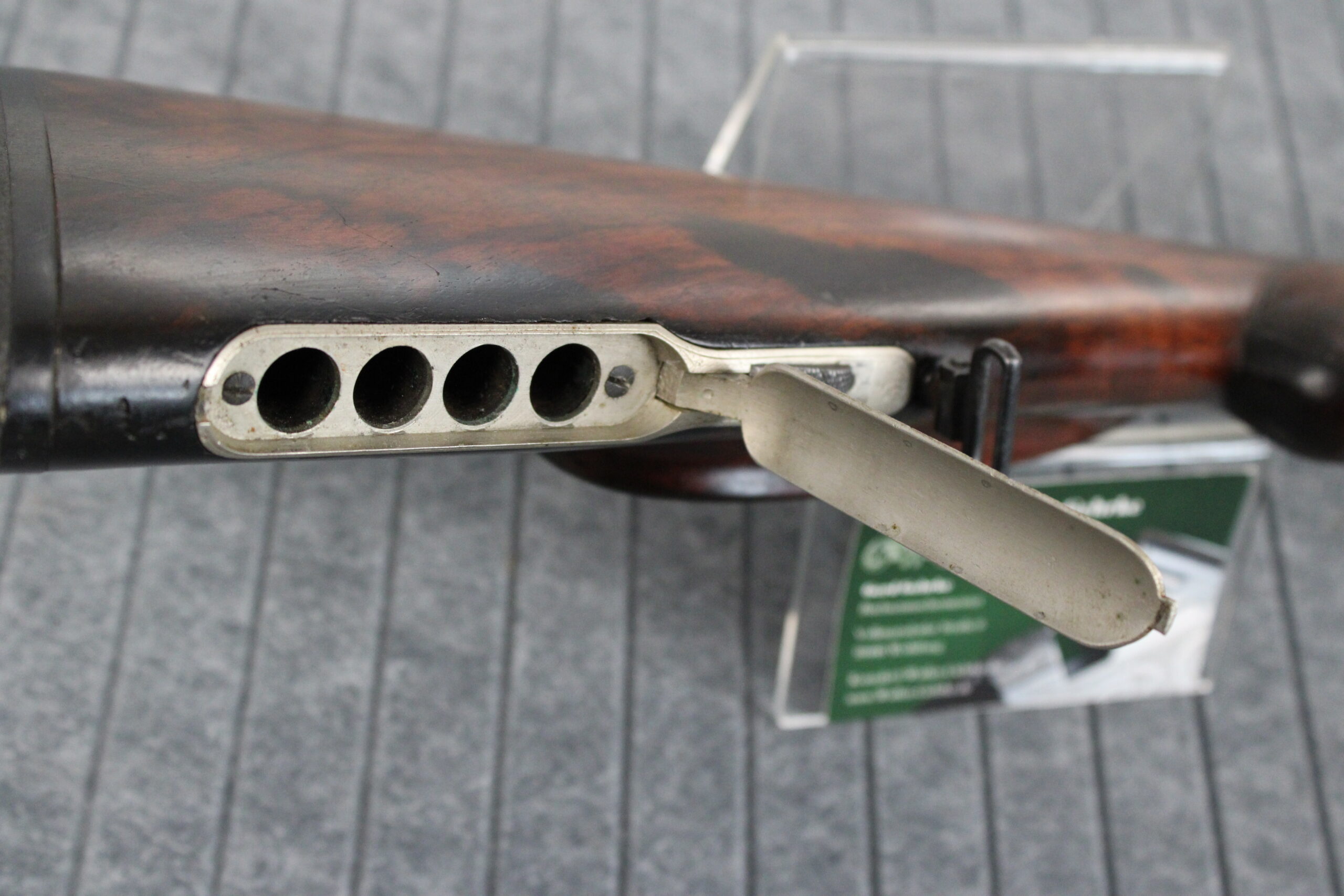 Der Schaft hat Schaftmagazin mit Klappdeckelund, eine Schaftlänge von 39cm, Es ist vermutlich der originale Schaft. er hat trotz leichter Aufarbeitung Druckstelle, leichte kratzer sowie dunkle Flecken ( lediglich optische Mängel) Er hat ein poliertes Trueoil finish.