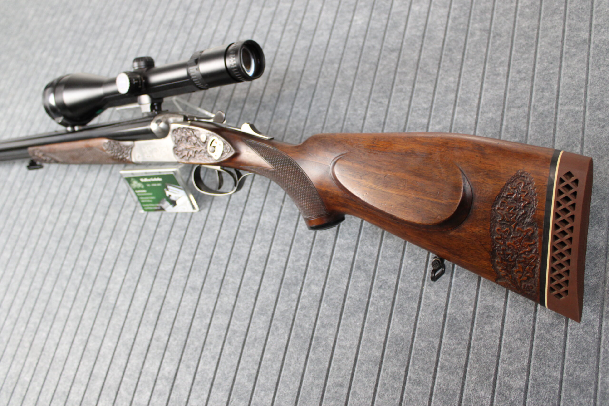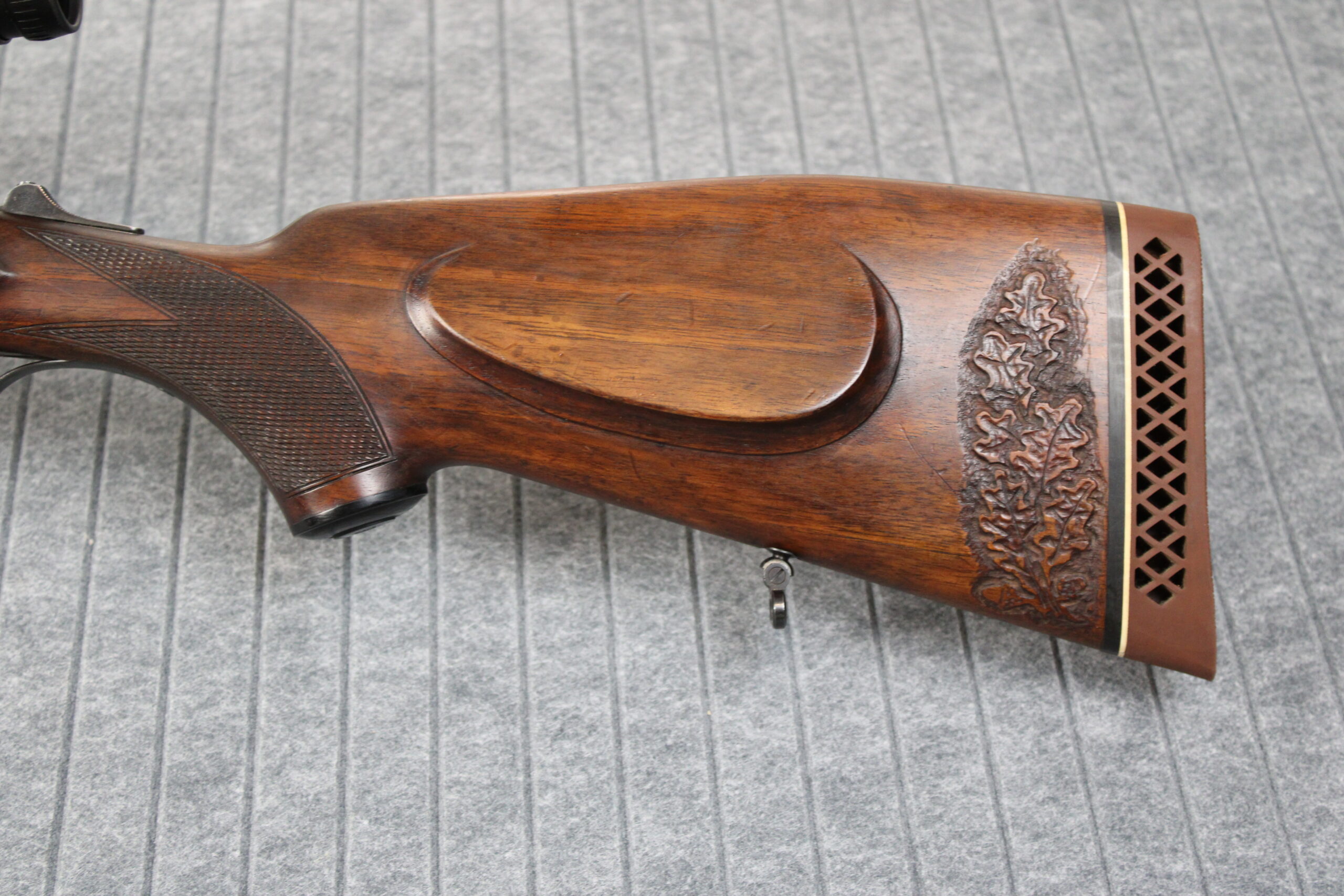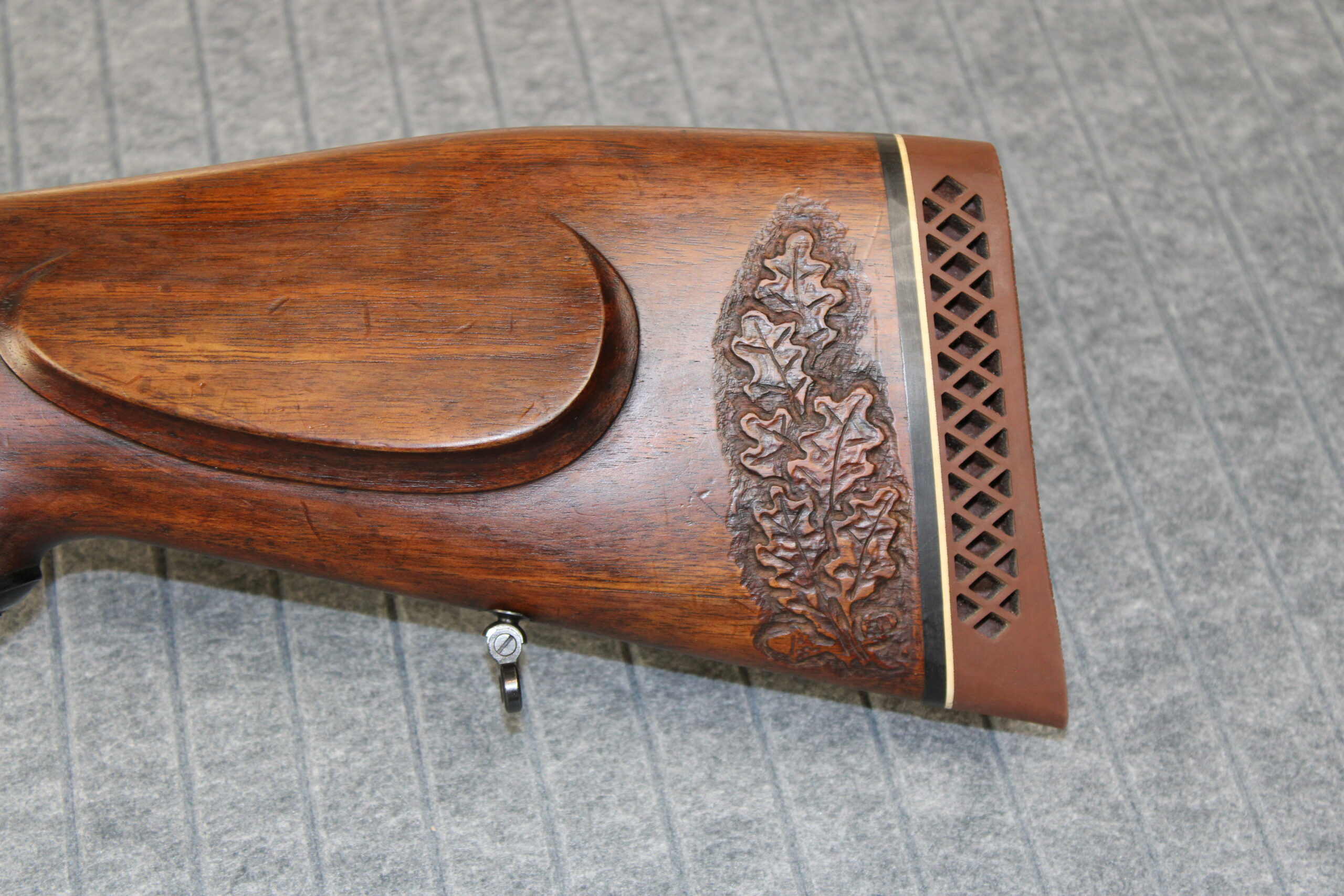 Der Schaft mit leichten Gebrauchsspuren kommt mit schöner Eichenlaub Verschneidung, scharfer Fischhaut, einer ventilierten Gummischaftkappe und einem breiten Biberschwanzvorderschaft.