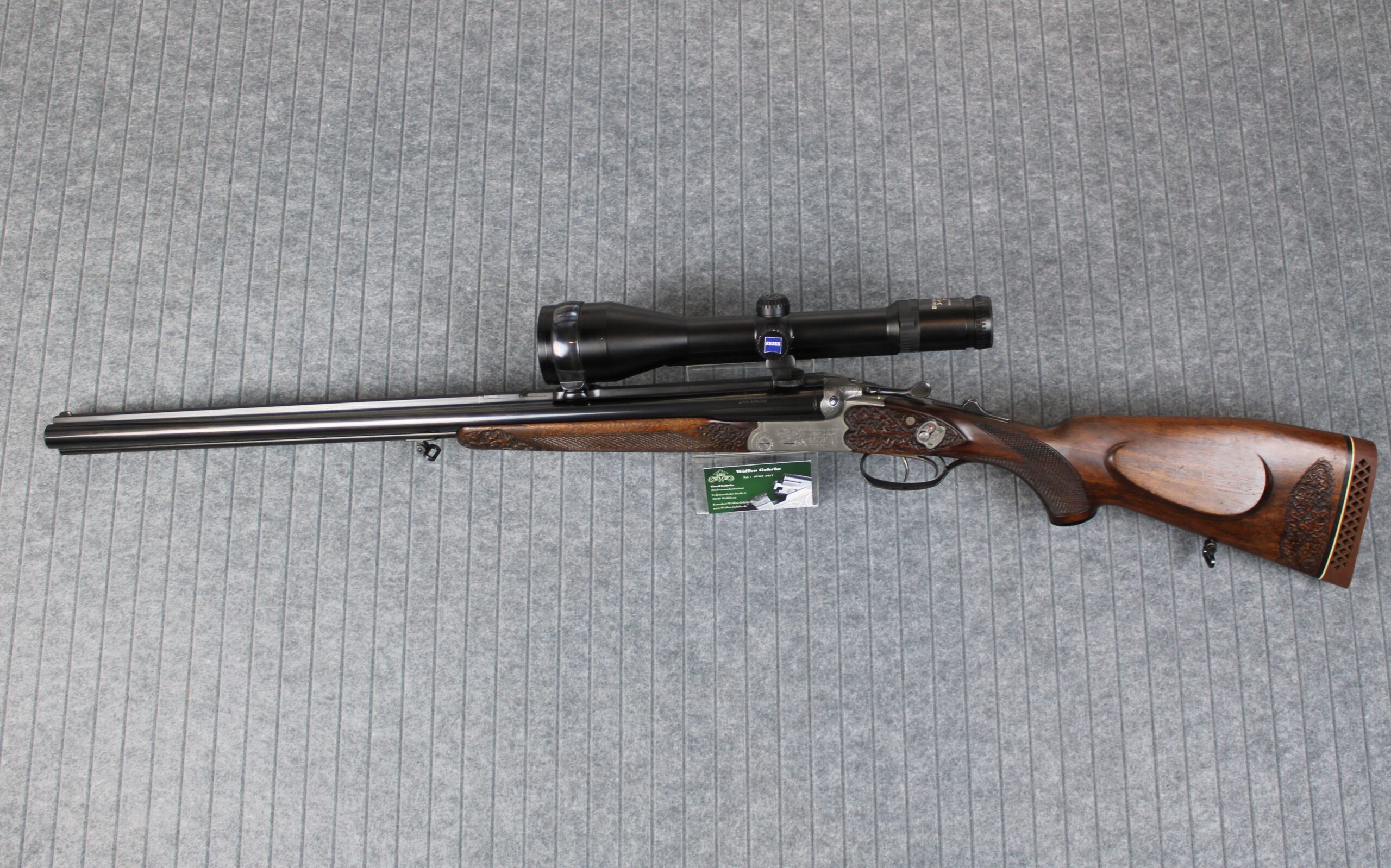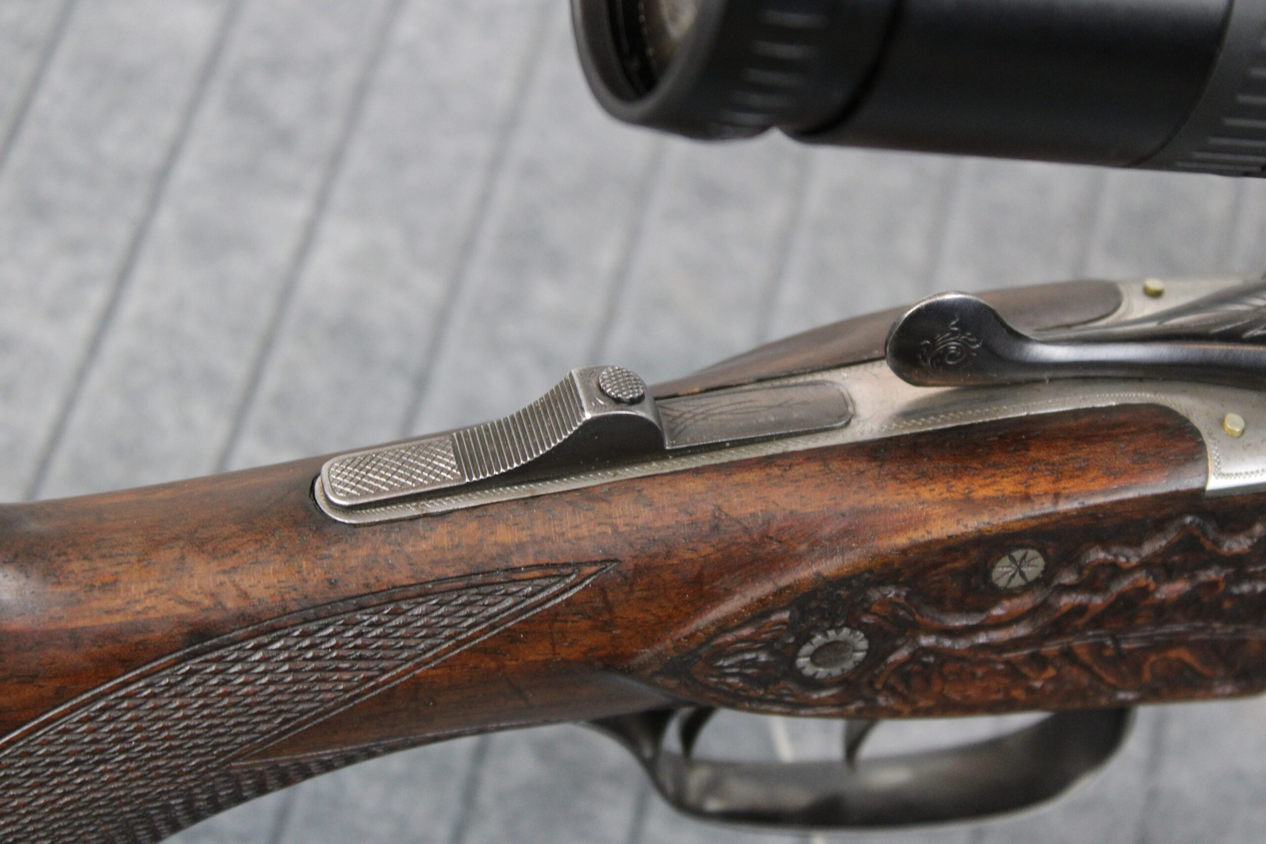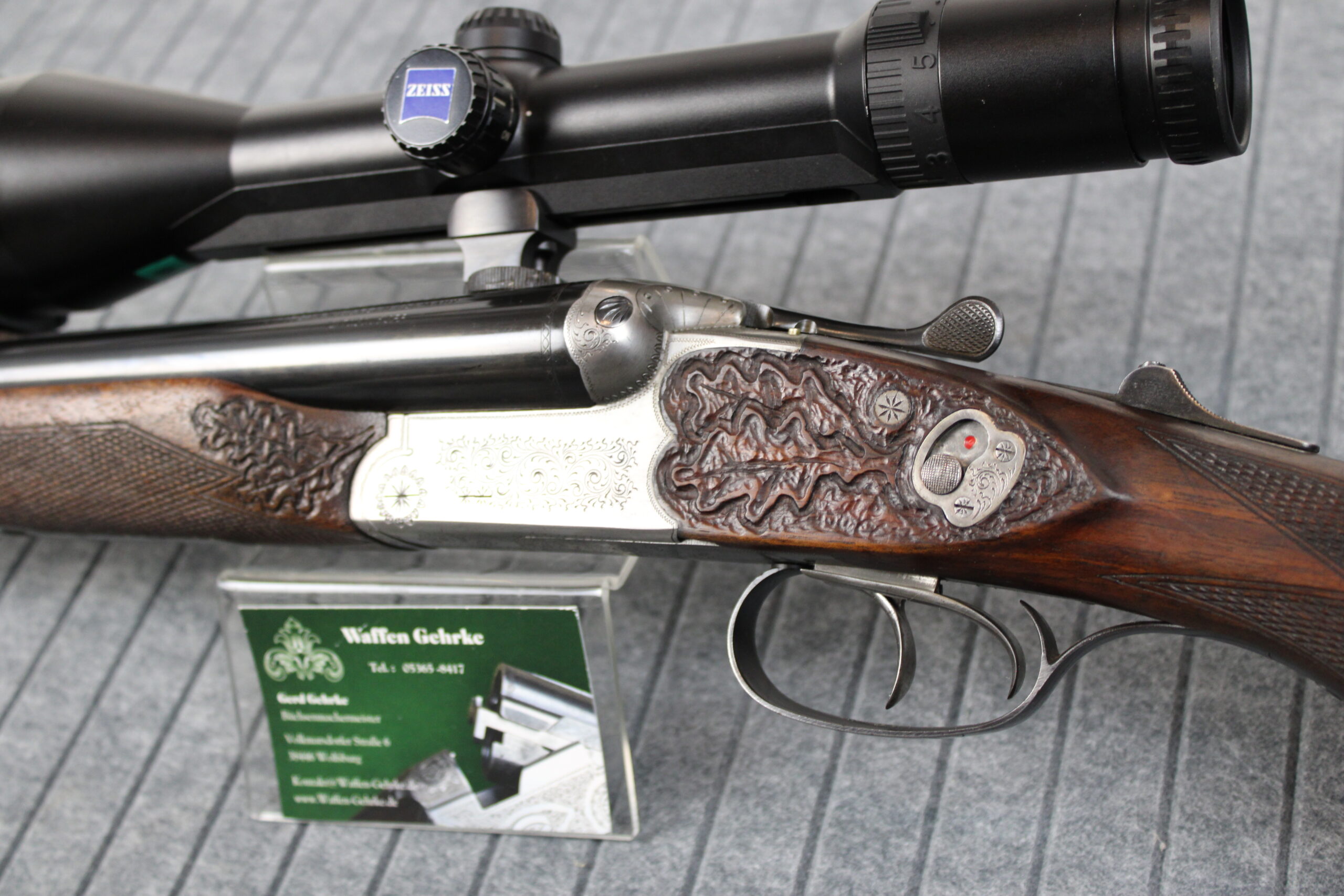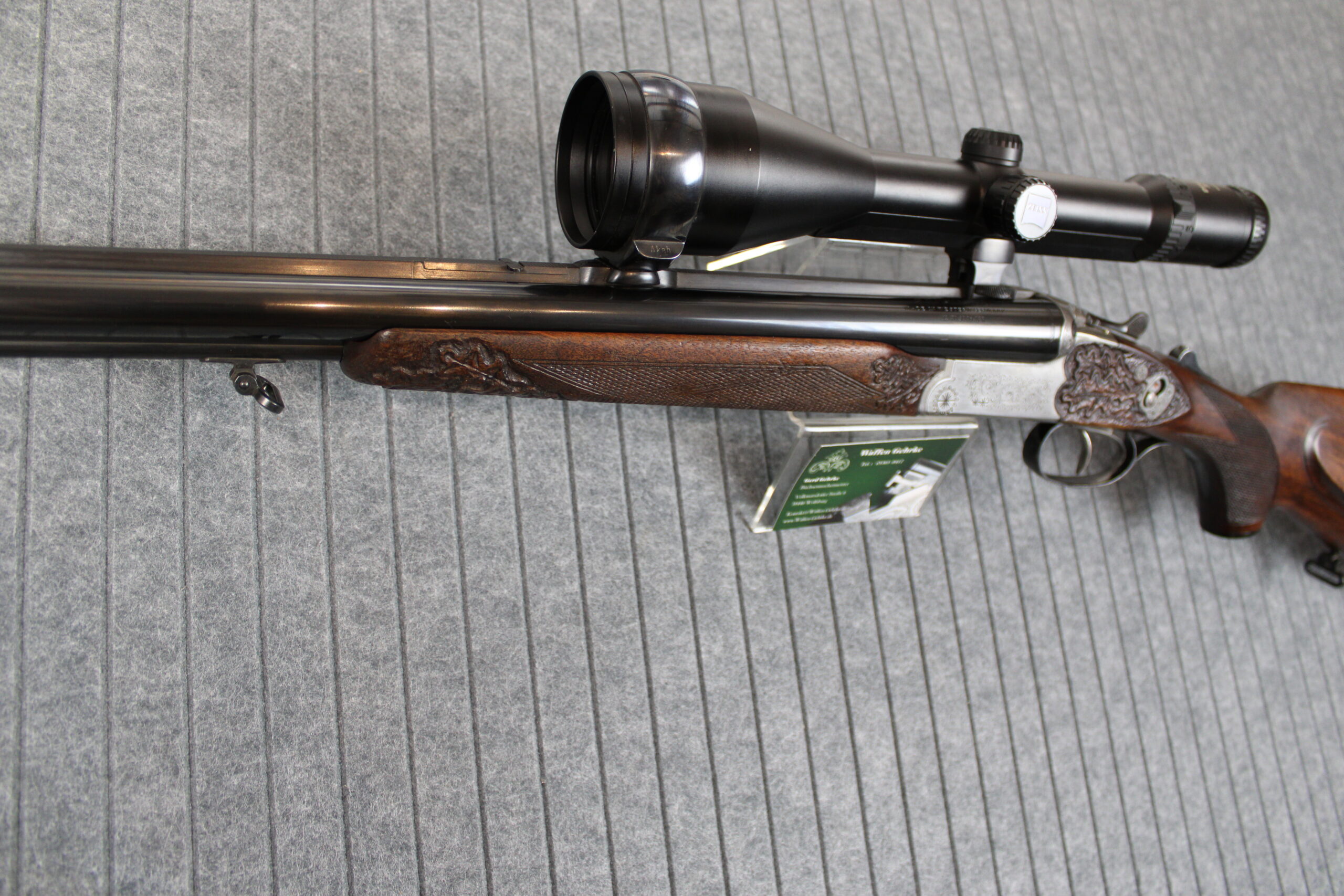 Der Schaft mit leichten Gebrauchsspuren kommt mit schöner Eichenlaub Verschneidung, scharfer Fischhaut, einer ventilierten Gummischaftkappe und einem breiten Biberschwanzvorderschaft.