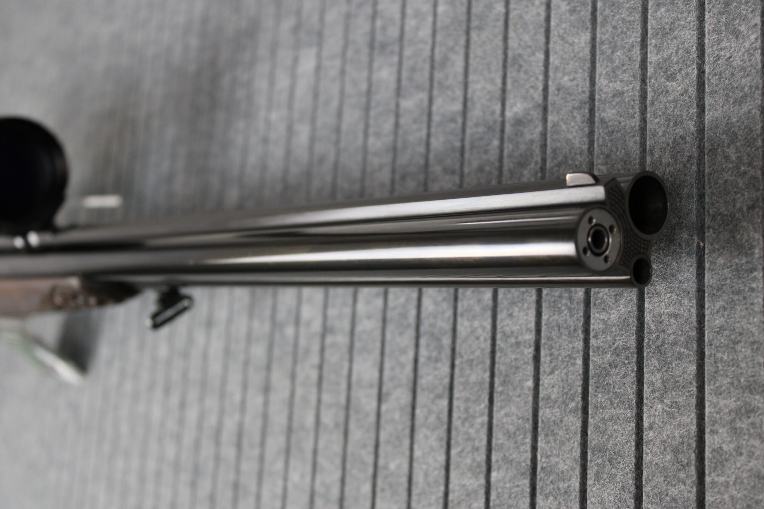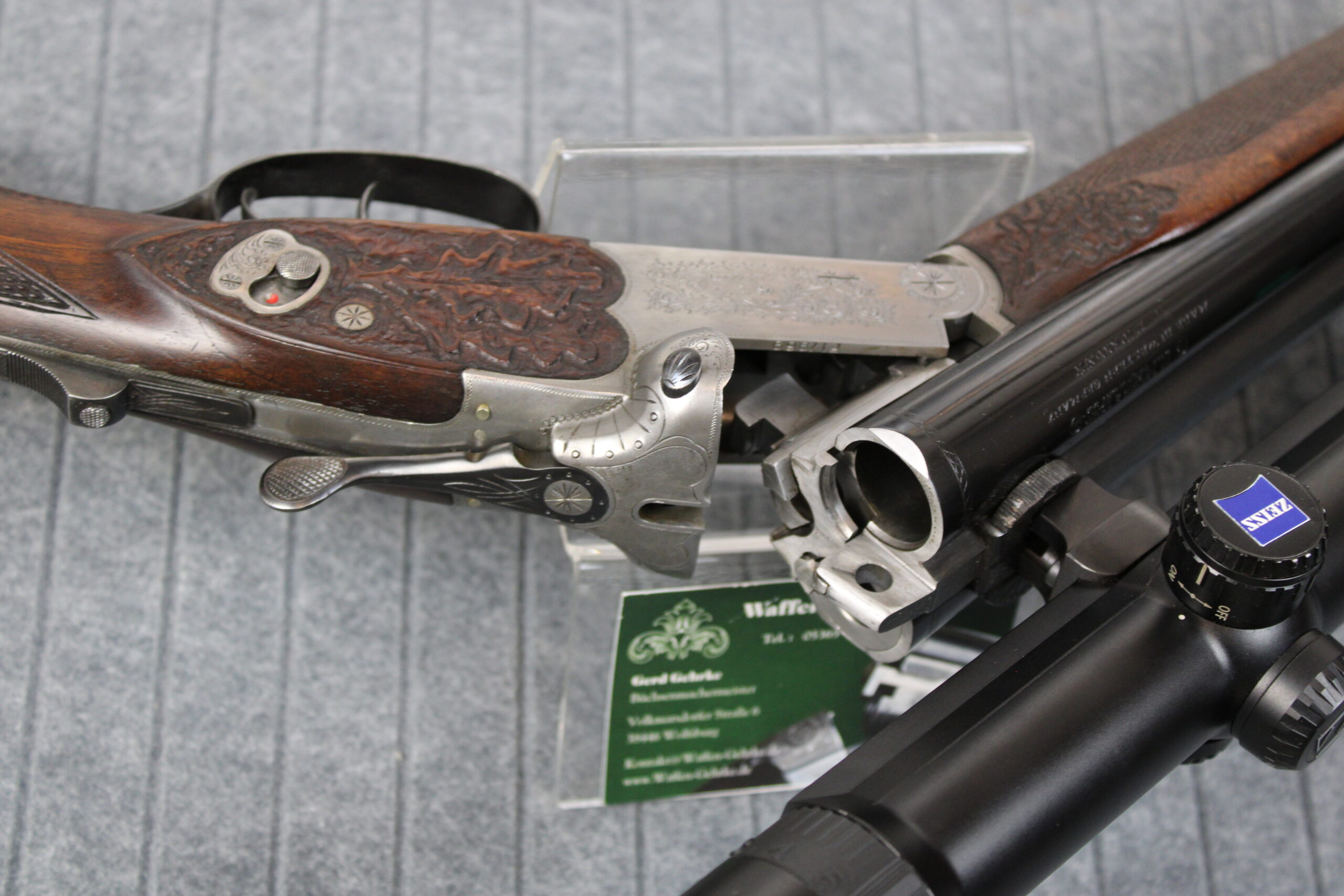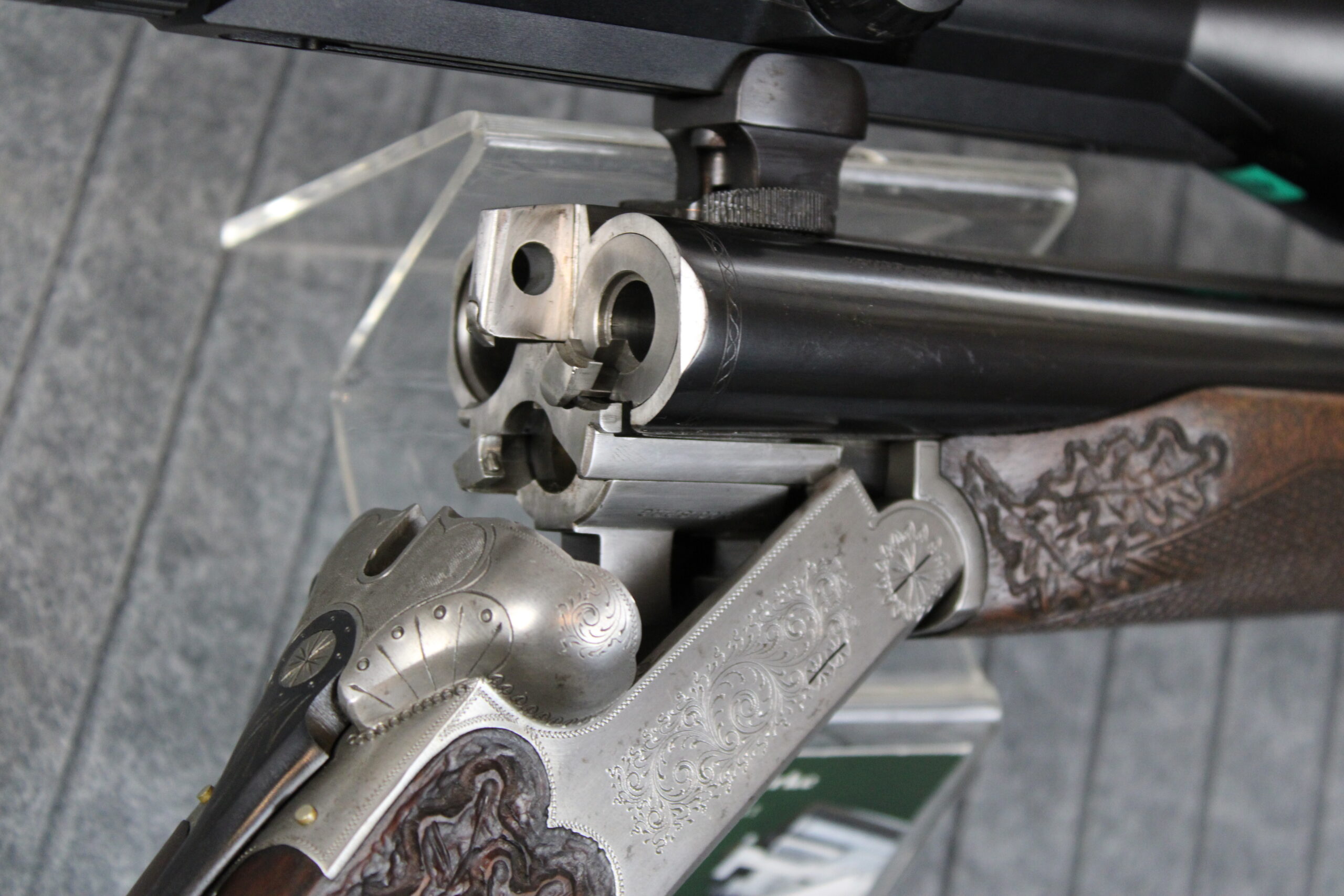 Der Drilling verfügt über eine seperate Kugelspannung welche auch das Klappvisier aufstellt, einen Rückstecher im vorderen Abzug und eine seitliche Sicherung.